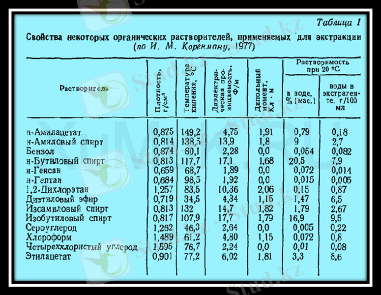 Органикалық еріткіштермен экстрагирленетін заттарды сандық анықтау үшін таралу константасы мен коэффициентін, экстракция дәрежесін және т. с. с білу керек.