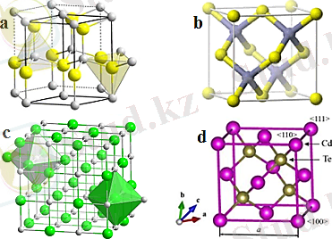 Сурет 1 а - вурцит - алтыбұрышты; b - мырыш қоспасы - текше; c - NaCl - CdTe нанобөлшектерінің текше құрылымы; d - CdTe нанобөлшектерінің жазықтықтары мен тор параметрін көрсететін кристалдық құрылым