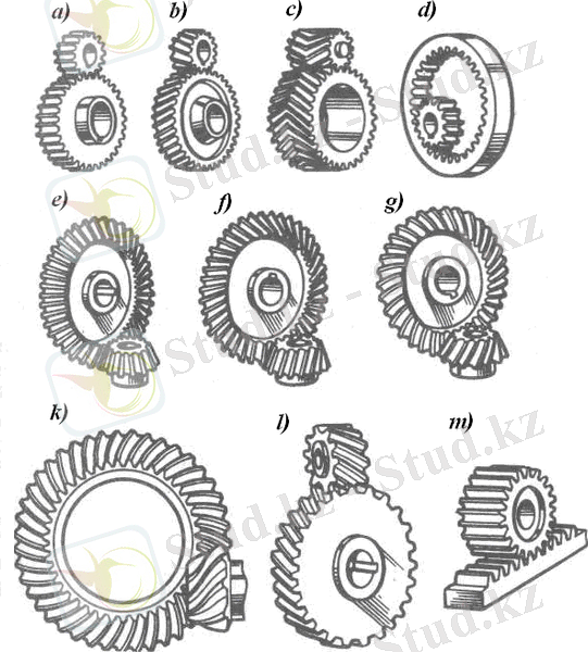Тісті берілістердің негізгі түрлері (1 - сурет) : өстері параллель: а - цилиндрлі түзу тісті, b - цилиндрлі қиғаш тісті, c - шевронды, d - ішкі ілініспен; өстері қиылысқан: e - конусты түзу тісті; f - конусты тангенсалды тісті, g - конусты қиғаш тісті; өстері айқасқан: h -гипоидті, k - винтті, l - тісті-рейкалы түзу тісті.