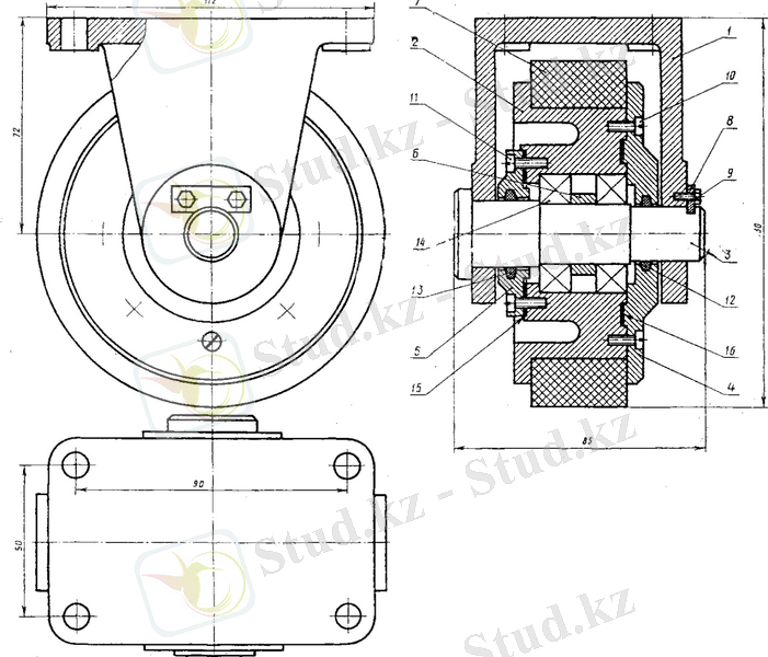 Бізге берілген қондырғы(1, 1-сурет) заводтар мен цехтарда арнайы жолдармен жүретін арбалардың дөңгелегі ретінде қолданады. Біз, берілген қондырғыдағы (колесо - дөңгелек) таңдалған бөлшектің орны мен қызметін анықтау үшін қондырғының құрастыру реті және атқаратын жұмысын түсініп алуымыз керек. Қондырғыны құрастыру реті: дайындалып жасалған дөңгелек қорапқа(2) мойынтіректің біреуін(14) одан кейін төлкені(6), соңынан екінші мойынтіректі(14) және құрсау(бандаж-сыртқы резина) (7), тығыздауыш(12) орнатылған үлкен қақпақты(4) қорапқа (2) белгілі диаметірмен дайындалған картон қағазды(16) қыстыра отырып винтпен(10) бекітеміз, қораптың екінші жағын тағыда тығыздауыш(13) орнатылған үлкен қақпақты(5) қорапқа (2) белгілі диамтірмен дайындалған картон қағазды (16) қыстыра отырып винтпен(11) бекітеміз, құрастырылып болған қорапты ось(3) арқылы тіреуішке(1) бекітеміз, тіреуішке осьті осьтегі ойыққа планканы(жұқа тақтайша) (8) бұранда(9) арқылы отырғызып осьтік жылжыуын тоқтатамыз. б