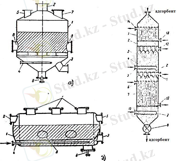 Адсорбент қабаты қозғалмайтын адсорберлердің құрылымы: қарапайым болып мерзімді әрекетті жұмыс істейді. Олар цилиндр пішінді болады да, тік /1. 2 а - сурет/ немесе горизонталь /1. 2 ә - сурет/ орналасады. Адсорбентті регенерациялағанда қоршаған ортаға таралатын жылу мөлшерін азайту мақсатында адсорберлердің сыртқы беті жылулық оқшаулағышпен қапталады. Адсорбер ішіне тор бетіне адсорбент қабаты /2/ жүктеледі. Булы - газды қоспа адсорбент қабатынан өтіп, аппараттан келте құбыр арқылы шығарылады. Адсорбентті регенерациялау үшін барбатер /3/ арқылы су буы беріледі.
