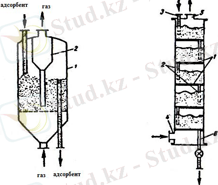 1. 5-суретте көп сатылы жалған сұйылу қабатындағы адсорбердің тәсімі көрсетілген. Колонна /1/ ішіне құйылғы құбыры /3/ бар газ таратқыш торлар /2/ орнатылған . құйылғы құбыр /3/ газ ағынына қақпа рөлін атқарады, яғни газ тек бір тор тесіктерінен өтіп, адсорбентті жалған сұйылдырады. Газды қоспа төменгі келте құбырмен беріліп, жоғарыдан шығарылады.