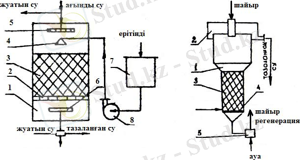Шайырды регенерациялау үшін пневмопульсациялы аппараттар /15. 9-сурет/ қолданылады. Шайыр конусты құбырмен беріледі. Аппаратқа ауа берілгенде шайыр ерітіндіге қарама - қарсы бағытта қозғалып, жоғарыдан шығарылады. құбырдағы шайыр бағанасы кері клапан рөлін атқарады.