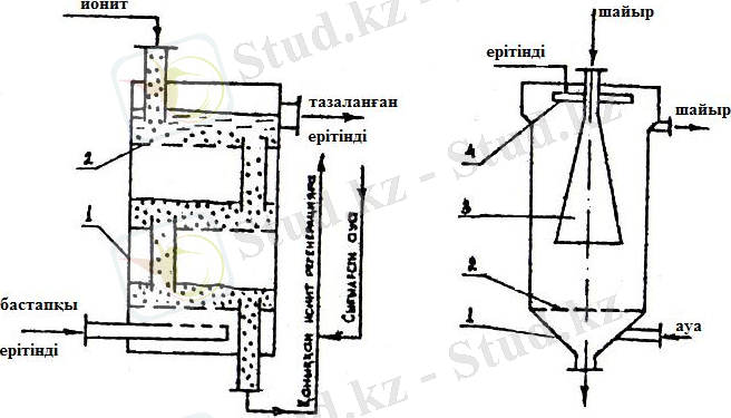 Ионалмасу процесінің тиімділігін арттыру мақсатында жалған сұйылу қабаты және пульсациялар колонналар қолданылады. Көп сатылы жалған сұйылу қабаты ионалмасу аппараттар /1. 10-сурет/ тор тесікті колоннадан құрылған. Аппаратта ионитпен бастапқы ерітінді қарама - қарсы бағытта әрекеттеседі. Тазаланған ерітінді аппараттың жоғарғы, ао ионит төменгі жағынан шығарылады. Қаныққан ионит ауа арқылы тасымалданады. Регенерацияланған ионит шнек арқылы аппараттың жоғарғы жағына қайта беріледі.