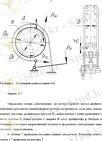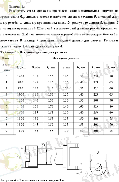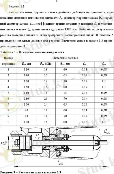 Р н - сұйықты айдау қысымы, D н - сорап поршенінің диаметрі, d шт - штоктың сыртқы диаметрі, f ц - поршеннің цилиндрге үйкелу коэффициенті, f ш - штоктың тығынының штокқа үйкелу коэффициенті, К с = 0, 15 - шток тығынынның радиальді қысымының орташа мәнінің коэффициенті, l шт - шток ұзындығы 1390 мм-ге тең болғандағы екі жақты әсер ететін бұрғылау сорабының штогын беріктікке есептеу. Есептеу нәтижесі бойынша штокқа материал таңдап, конструкциясына сәйкес беріктіктегі штокты жобалау. Есептеуге қажетті мәліметтер 9-кестеде, ал тапсырманы орындау үшін есептік сұлба 4-суретте көрсетілген.