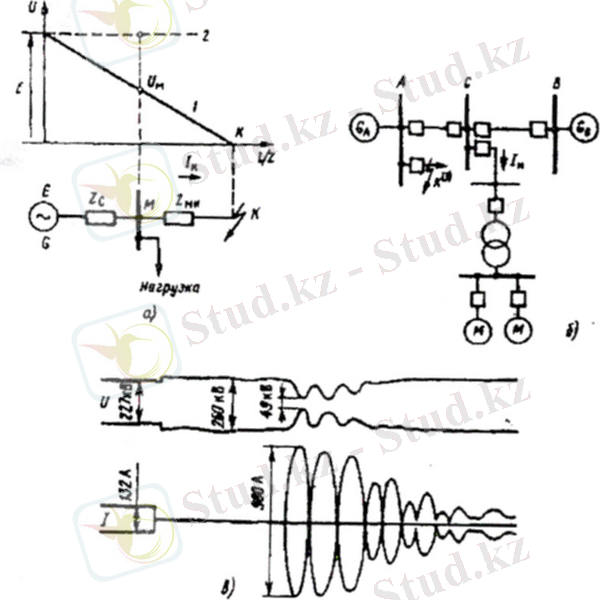 а- тұтынушылар жұмысына; б- энергожүйенің қалыпты // жұмысына; в- ток осциллограммасы мен асинхронды режимдегі кернеу.