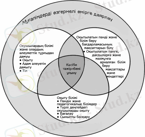 Диаграммада әр мұғалім үшін маңызды болып табылатын білім, дағды және бейімділіктің негізгі 3 саласы көрсетілген. Оларға: