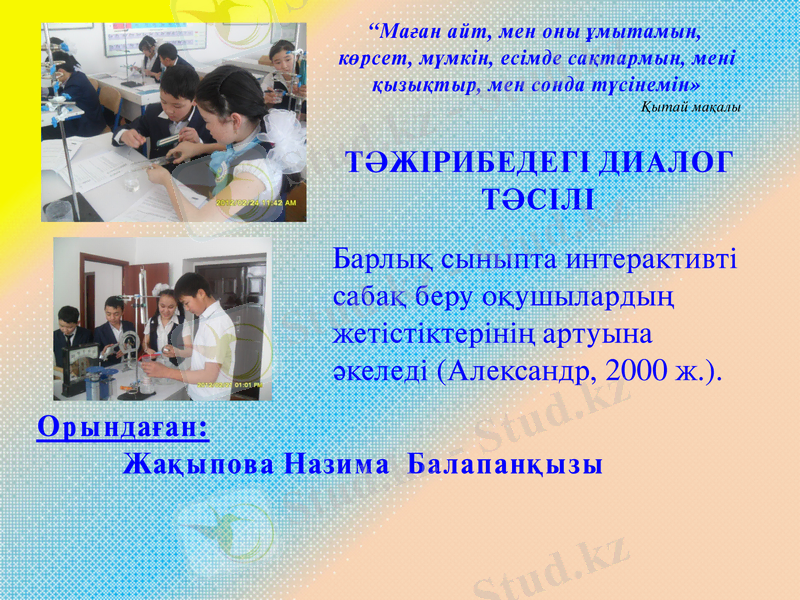 Сонымен қатар, дидактиканың талаптарына байланысты оқушыларды оқытуға емес, тұлғалық-бағытталған, танымдық қызметін ұйымдастыруға, оқу процесін өзара диалог негізінде құруға бағыттадым.