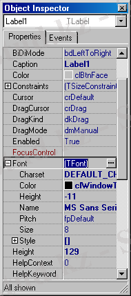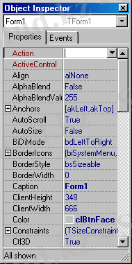 Форманы не онда орнатылған компонентті программа құру үшін дайындау оның кейбір қасиеттерінің мәндерін өзгертуден басталады. Қасиеттер тізімі Обьект инспекторы (Object Inspector) терезесіне енгізілген. Тізімді инспектор терезесіне шығару үшін сәйкес обьектіні (форманы не формада орнатылған форма компонентін) бір шерту арқылы таңдау керек. Инспектор терезесінің жоғарғы қатарына таңдалған обект атауы да жазылып қойылады. Мысалы, Delphi іске қосылған кезде форманың ашылған қасиеттер терезесі 1. 1-суретте көрсетілген. Терезенің екі қосымша беті бар: Properties (Қасиеттер) және Events ( Оқиғалар) . Терезе ашылғанда екі бағанға енгізілген жазулардан тұратын оның Properties бөлімі ашылулы тұрады(1. 1-сурет) . Бірінші бағанда көрінетіндер - қасиет атаулары, екінші бағанға сәйкес жазылғандар - олардың мәндері.