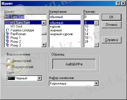Font (Ш рифт) ─ формаға енгізілетін мәтін шрифтін орнату қасиеті. Оны таңдап, оң жағында көрінген көп көп нүкте ( . . . ) түймесін шерткен кезде сұхбаттық шрифт таңдау терезесі көрінеді (1. 3─ сурет) . Терезеден, әдеттегідей, қажетті шрифт типін, өлшемін таңдап (мысалы, Times Kaz, 10), OK түймесін шерту керек.