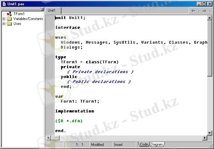 Uses (қолдану) - Турбо Паскальдағы сияқты, қызметші сөз. Оның соңына программада пайдаланылатын стандартты (кітапханалық) Forms модулі мен Delphi-дің модульге алғашқы рет меншіктеген атауы (Unit1) жазылған. Unit1-ден соң оның қайсы модульдік файлда құрылатыны (in ‘Unit1. pas’) және онымен байланысты форма атауы көрсетіледі ({Form1}) .