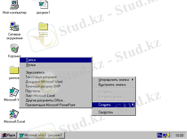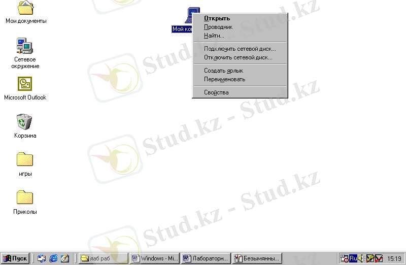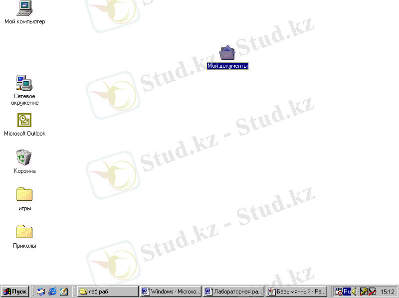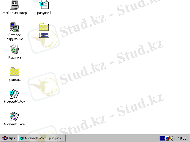 Мой компьютер, Сетевое окружение, Корзина, Мои документы, «Пуск» батырмасы Жұмыс үстелiнiң стандартты элементтерiне енедi.