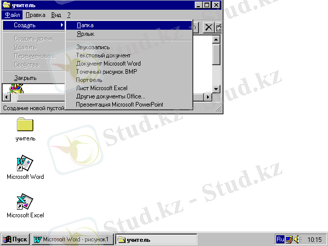 - Егер Жұмыс үстелiнде немесе ашық тұрған бумаға жарлық құру қажет болса, онда сүйреу арқылы жарлық құрылады.