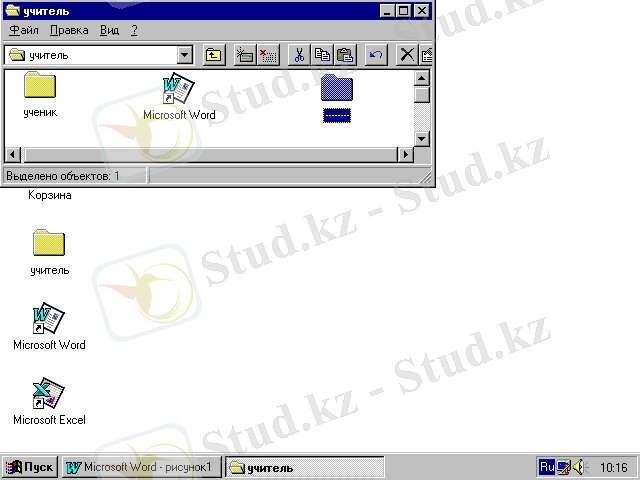 - Меню арқылы объектiлердi көшiру жүзеге асырылады. Ол үшiн бума терезесiнен объектiнi бөлiп алып, Правка🢥Копироватькомандасын орындаңыз. Содан кейiн қабылдап алу бумасының терезесiне көшiп, мына команданы орындаңыз:Правка🢥Вставить.