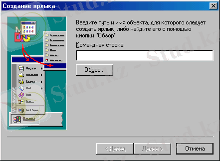 - Обзорбатырмасына бассақ, онда хабар алмасушы терезе пайда болады да, осы терезеден жарлық құруға қажеттi объектiнi таңдап аласыз басасыз.