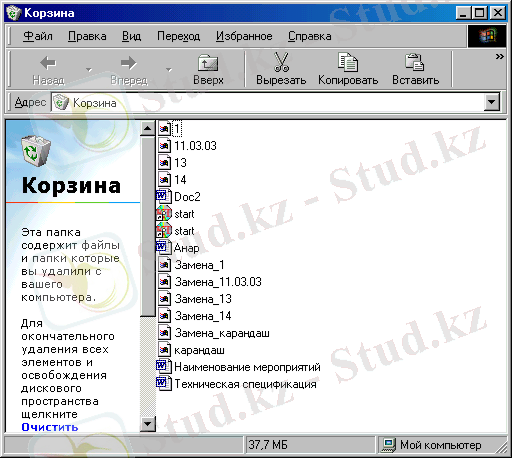 Корзина белгiсi бойынша екi рет бассаңыз өшiрiлген объектiлер тiзiмiнен тұратын Корзины терезесi ашылады.