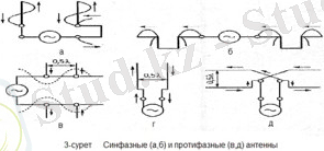 Егер көрші екі сым бір-бірін қаптаса және фазамен сай келсе, алаң бірін-бірі күшейтеді. Ол үшін толқын жарты ұзындығына фазаны ығыстыру керек, мысалы, бөлінбейтін шлейф есебінен. (3 а-сурет) . Аса көп таратылған синфазалы антенаның принципі осыған негізделген. (3 б-сурет) .