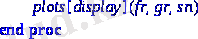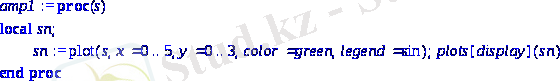 sn:=plot(s, x=0. . 5, y=0. . 3, color=green, legend=sin) :