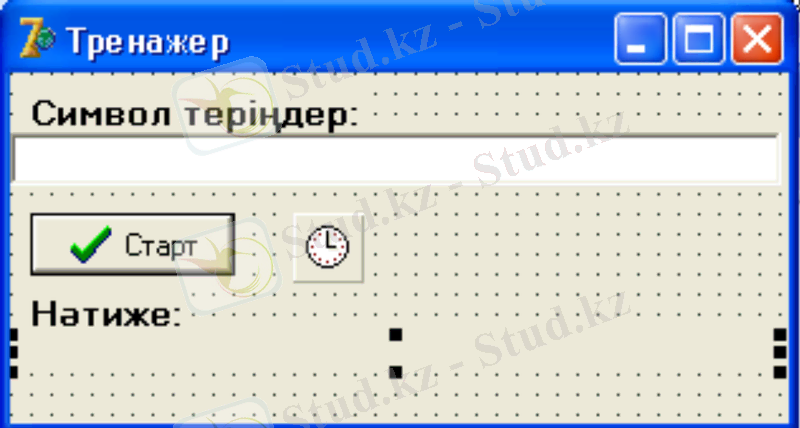 - Формаға Edit мәтіндік өріс компонентін қойып, 10 секунд уақыт аралығында қолданушының қанша символ тергенін анықтайтын қосымша жасаңдар.