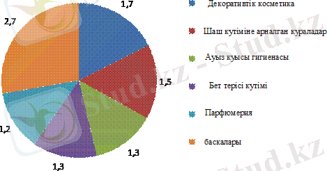 2012 жылы Қазақстан нарығын зерттеуде ең үлкен нарық сегментін декоративті косметика алған (1, 7 млрд. тг. ), шаш күтіміне арналған құраладар (1, 5 млрд. тг. ), ауыз қуысы гигиенасына (1, 3 млрд. тг. ), бет терісі күтіміне (1, 3 млрд. тг. ) және парфюмерияға (1, 2 млрд. тг. ) (сурет - 1) .