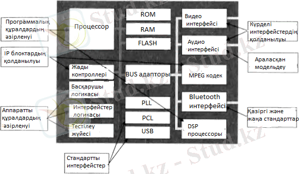 • Жүйелік (SLD - system level design) сатыда IP технологияны негізге ала отырып, SoC жобалауының әдіснамасы мен жаңа да танымал жобалау әдістерімен