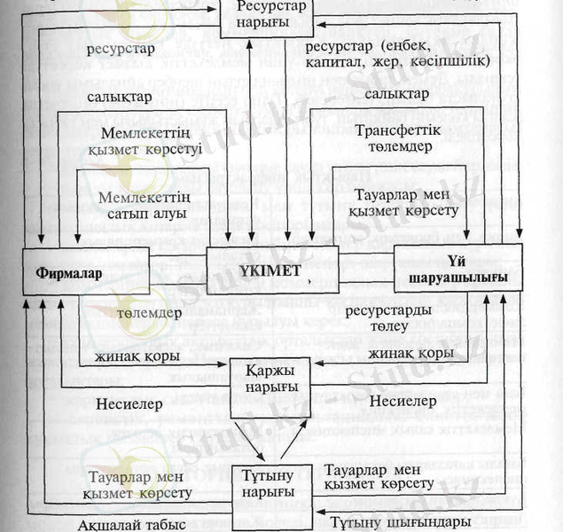 Нарықтық экономиканың негізгі шаруашылық субъектілеріне үй шаруашылығын, фирма мен үкіметгі жатқызамыз. Бұл субъектілер бір-бірімен ресурс нарығында. қаржы мен тұтыну нарығында өзара іс-әрекет жасап, шығыс пен кірісті айналым жасайды. Мұның өзі кестелік түрде (24-1 суретте) көрсетілген.