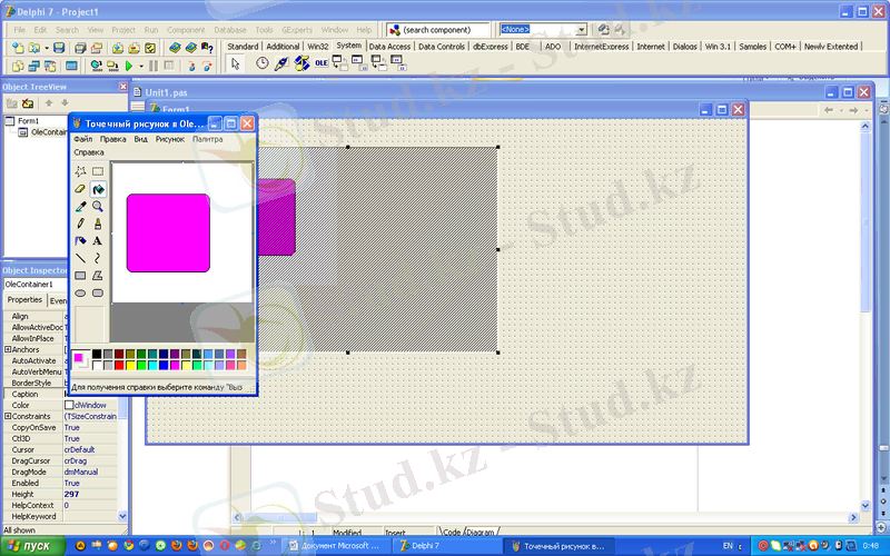 - Ole container компоненттін екі рет шертіп, тақырыбына Точечный рисунок Ole Container 1- Paint жазылған, Paint терезесі көрінеді. Paint мүмкіндігін пайдаланып төртбұрыш ішіне қалаған түрде сурет салып редакцияауға болады.