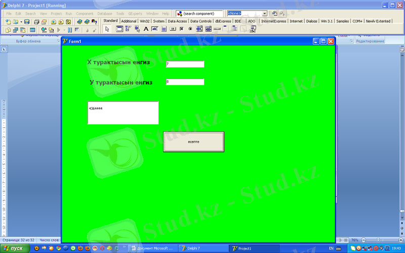 - Форма бетіне компоненттерді орналастырып болғаннан кейін, орында батырмасының ButtonClick оқиға өңдеушісіне төмендегідей мәліметтерді енгіземіз: