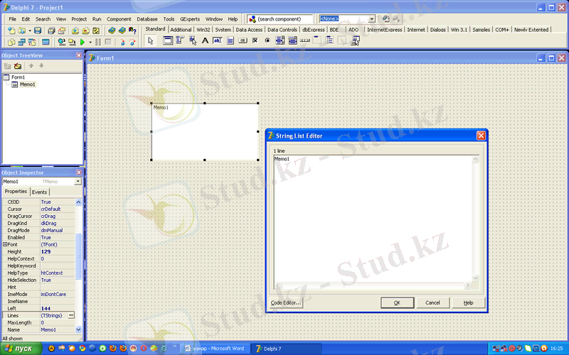 - Memo компонентінен өзге компоненттерді форма бетіне орналастыруды және олардың қасиеттеріне өзгертулерді енгізуді, біз қарастырдық.