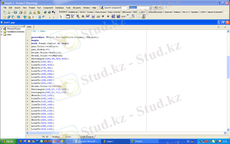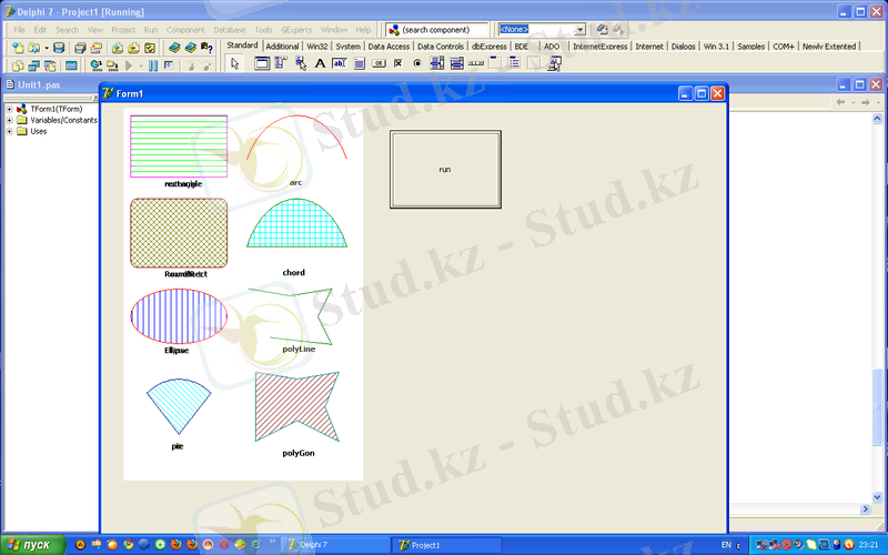 - Батырманы басқанда графикалық фигуралар шығу үшін Button компоненттін орналастырып, Caption қасиетіне « Run» мәтінін енгіземіз және ButtonClick оқиға өңдеуші процедурасына төмендегі программа мәтінін енгіземіз: