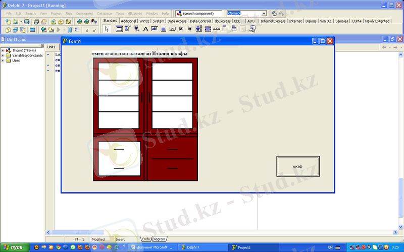 - Button компоненттін орналастырып, Caption қасиетіне «Шкаф» мәтінін жазамыз және ButtonClick оқиға өңдеуші процедурасына төмендегі программа мәтінін енгіземіз.