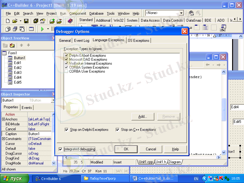 Дербес өңдеушінің жұмысын көру үшін жалпы өңдеушіні уақытша тоқтата тұру керек, ол үшін Tools -> Debugger Options командаларын орындап, пайда болған терезеде Language Exceptions жапсырмасының Stop on Delphi Exceptions және Stop On C++ Exceptions немесе Integrated debugging опцияларындағы флажокты алу керек /4. 14(А, Б, С) -4. 15(А, Б, С) суреттер/ .