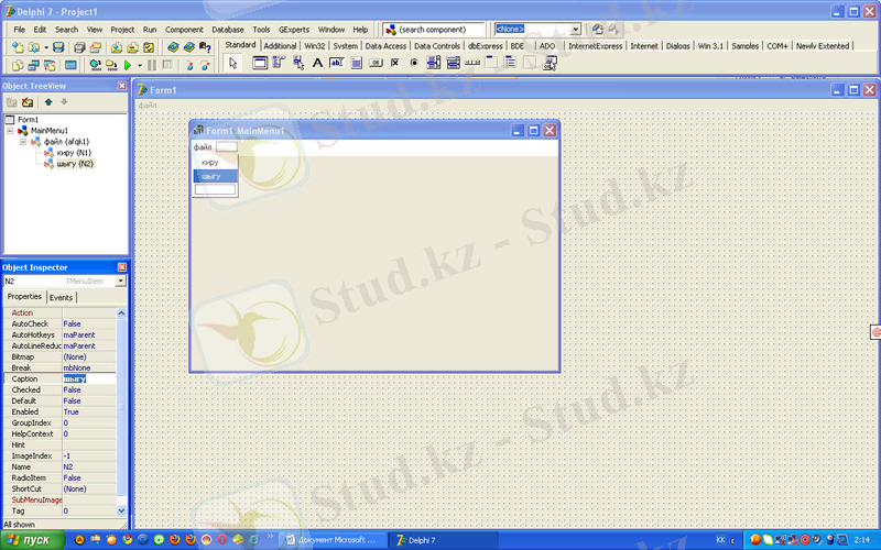 - Осы компоненттің Caption қасиетіне бірінші бас менюдің атын енгіземіз, мысалы «файл» деп жазайық, содан Enter батырмасын басамыз.