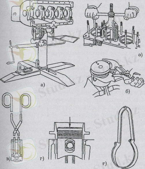 құрылғы; в - түрткіштерді босатқыш; г, ғ - поршенъ сақиналарын қысып, поршенъді цилиндрге кигізетін құрылғы
