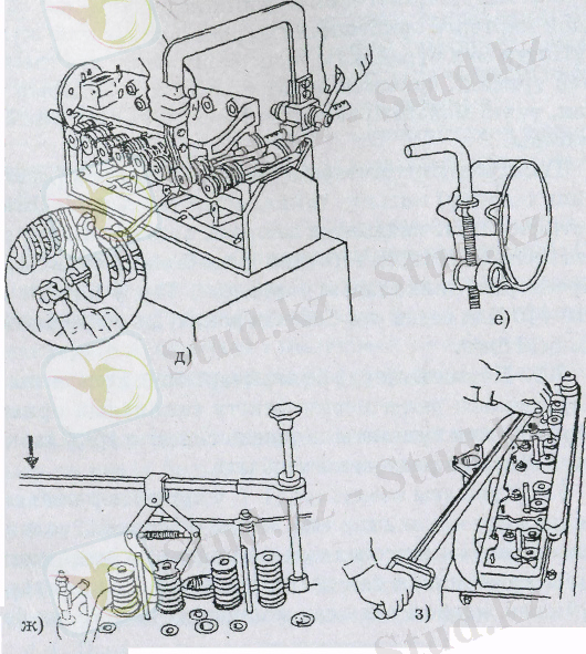 д - поршенъді қысқыш; е, ж - клапандар сухариктерін алуға және орнатуға арналған құрылғы; з - динамометрлік кілтті пайдалану әдісі