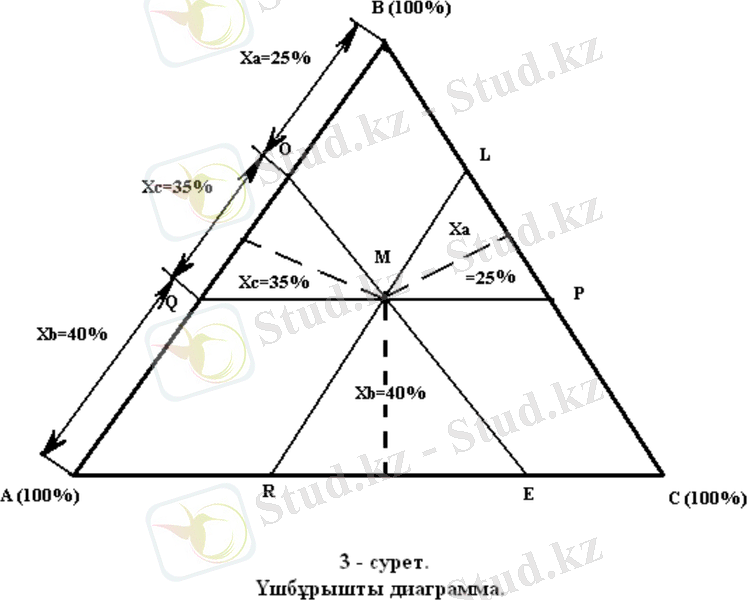 Тең қабырғалы үшбұрыштың төбелері таза құрастырушылардың /100% / А, В, С құрамына сәйкес болады, яғни А нүкте ажыратылатын ерітіндінің таза еріткіші /А/, В-нүкте таза ажыратылатын затты /В/, ал С - нүкте таза экстрагентке сәйкес болады.