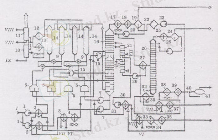 1, 7, 8, 15, 20, 23, 29, 31 - сорғылар; 2, 27, 30 - жылуалмастырғыштар; 3, 33, 36 - буландырғыштар; 4, 13, 25, 34, 35, 37, 38, 39 - тоңазытқыштар; 5, 6 - құбырлы пештер; 9 - төрт бағытты шүмектер; 10, 19, 22, 24, 41 - сыйымдылықтар; 11 - скруббер; 12 - сүзгі; 14 - камералар; 16, 21, 26 - колоналар; 17, 18, 25 - конденсатор - тоңазткыштар; 32 - қайнатқыш; 40 - инжектор; I - шикізат; II - Газ; III - бензин; IV - жеңіл газойл; V - ауыр газойл; VI - химиялық тазартылған су; VII - су буы; VIII - су; IX - ауыр мұнай өнімдері.