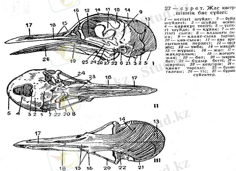 1 - мойын омыртқалар; 2 - көкірек (кеуде) омыртқалар; 3 - құйрық омырткалар: 4 - құйыршық сүйек; 5 - ілмек өскіні бар қабырраның жоғарғы бөлімі: 6 - қабырғаның кұрсақ бөлімі; 7 - тес; 8 - төс қыры; 9 - жауырын; 10 - коракокд; 11 - бұғана; 12 - ток. пан жілік; 13 - кәрі жілік; 14 - шынтақ сүйек; 16 - алақан сүйек; 6-1 - саусақ; 17 - 11 - саусақ; 18 - III - саусақ; 19 - мықын сүйек; 20 - шонданай сүйек; 21 - шап сүйек; 22 - ортан жілік; 23 - асықты жілік; 24 - сирақ: 25 - артқы аяғының 1 - саусағы; 26 - артқы аяғының IV - саусағы;