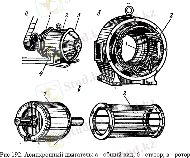 Металлкемкіш станоктарда ең көлемді таралған үшфазалы асинхронды айнымалы ток қозғалтқышы, қарапайым құрлысымен экуплуатацияға тиімділігі. Бұндай қозғалтқыш (192, а суретте) корпустан 2 және екі жанарындағы қақпақшадан 1 және 3. Корпустың ішінде қозғалмайтын жұмыс бөлігі статор қозғалтқышы орналастырылған (192, б суретте) онда сақина пішінді металл жүрекше 1, онда жеке орамалар орналасқан. 2. Ораманың басы мен соңы сыртқа шығарылып щитке бекітілген 4 (192, а суретте)