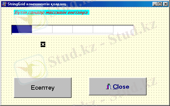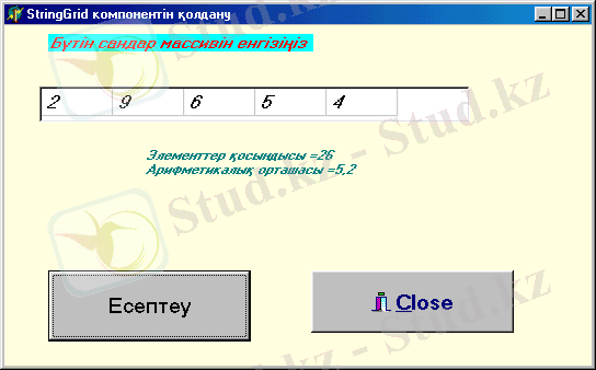 Сонымен қатар, екi белгi - Label1 (Caption - Бүтiн сандар массивiн енгiзiңiз) және Label2 (Caption - тазаланған), екi батырма - Button1 (Caption - Есептеу), BitBtn1 (Kind - bkClose) . Массив элементтерi StringGrid1 ұяшықтарынан көрсетiледi және Есептеу батырмасы басылғанда олар массивке меншiктеледi де элементтердiң қосындысы және орташа шамасы есептелiп, Label2 - ге шығарылады. Close батырмасы басылғанда программа жұмысын тоқтатады.