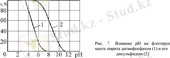 Пириттің түрлері мен модификациялардың флотациялануы жақсы зерттелген. Оның флотациялық қасиеті кристалл тордың физико-химиялық біртексіздігін, темір мен күкірттің түрлі қатынасы мен қоспалардың болуын анықтайтын, минералдардың генезисіне тәуелді. Пирит әлсіз қышқыл немесе бейтарап ортада рН 6-7 кезінде ксантогенаттар мен дитиофосфаттармен эффективті флотацияланады. Сілтілі ортада пириттің флотациясы нашарлайды және рН>8 кезінде толығымен жойылады (сур. 7) . Дитио- фосфаттар мен дитиокарбоматтар пирит бетіне халькопиритке қарағанда аз дәрежеде сорбцияланады, сондықтан олардың мыс-пиритті кендердің селективті флотациясы кезінде қолданған жөн.