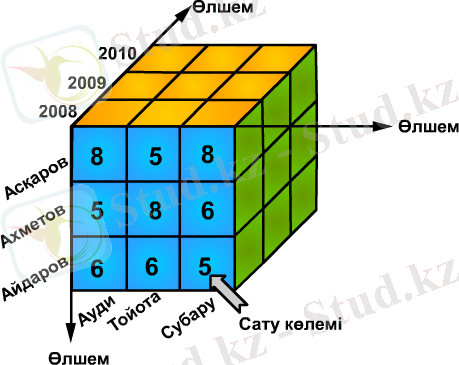 - үш өлшем:сату менеджері (oM осі), автомобиль модельі (oC осі), “ай” бірлігінен уақытша өлшем (oT осі) .