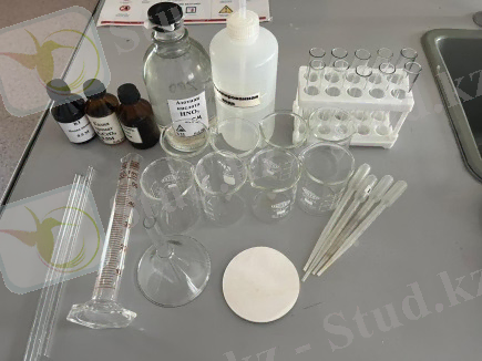 нөмірленген 50 мл-лік 11 химиялық стақан, 11 шыны таяқша, 11 шыны сүзгіш, сүзгі қағаз, нөмірленген 11 конус тәрізді колба, 50 мл өлшеуіш цилиндр, электронды таразы.