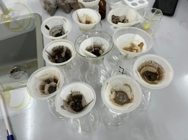 Ең алдымен, алынған топырақ үлгілері артық шыбықтар, ірі тастар, қоқыс және зерттеу барысында кедергі болатын басқа заттардан тазаланды. Әрқайсысын пластмасс контейнерге орналастырғаннан кейін 4 күн кептірілді.