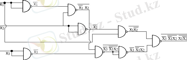 Әртүрлі типтегі логикалық элементтер бар: механикалық, электромеханикалық, электронды, пневматикалық, гидравликалық, оптикалық және т. б. Олар әртүрлі есептеу жүйелеріндегі ақпаратты түрлендіруге, сонымен қатар онымен әртүрлі операцияларды орындауға қызмет етеді. Мысалы, екілік немесе ондық жүйеде және т. б. Бұл тапсырмада логикалық элементтерден схеманы құрастыру керек ЖӘНЕ - ЕМЕС. Ол үшін конъюнктура функциясының инверсиясын қолданамыз. «ЖӘНЕ-ЕМЕС» операциясының да басқа атауы бар - Шеффердің штрихті. Кез келген кіріс саны бар ЖӘНЕ - ЕМЕС үшін мнемоникалық ереже келесідей естіледі - шығыс: «1» болады, егер кем дегенде бір кірісте «0» болса ғана, «0» барлық кірістерде «1» болса ғана . Бұл элементтің белгіленуін төмендегі орындалған тапсырмада көруге болады. Элементтердің әрқайсысында 2 кіріс және 1 шығыс бар. Бастапқыда бізде 3 ақпарат көзі бар. Бұл x 1 , x 2 және x 3 . Сондықтан 3. 2-тапсырмадағы функцияға қарап, кейбір мәндер үшін инверсияны қолданамыз. Біз схеманы бар өрнекке сәйкес элементтерді бір-біріне көбейту операциясымен жинаймыз.Тапсырма: