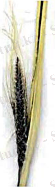 Бидайдың қатты қара күйесі. Ауру қоздырғышы - Tilletia caries Tul., T. levis Kuehn. саңырауқұлақтары (1-сурет) . Қоздырғыштардың өзара морфологиялық айырмашылықтары бар. Қазақстанның оңтүстік облыстарында T. сaries саңырауқұлағы кең таралған, ал екіншісі - солтүстікте кездеседі. Телиоспоралар бір-бірінен морфологиялық ерекшеліктеріне байланысты ажыратылады. T. сaries саңырауқұлағының споралары шар тəрізді, қабығы торлы, түсі қара-қоңыр, диаметрі 14-22 мкм. T. levis саңырауқұлағының споралары бұрыс пішінді, қабығы тегіс, ашық қоңыр түсті, диаметрі 15-23 мкм. Егінді бастыру кезінде залалданған дəндер жарылып, телиоспоралары шашылып, сау дəндердің бетіне түседі. Сол дəндермен бірге топыраққа түскен телиоспоралар көктемде базидияға өніп, одан бүршіктенген 4-12 базидиоспоралар түзіледі. Соңғылар бір-бірімен қосылып, инфекциялық жіпшеге айналып, өскінді залалдайды. Жіпшумақ өсімдікте диффузды таралып өсу нүктесіне жетіп, өсімдіктің барлық мүшелеріне (жапырақ, сабақ, масақ) тарайды. Сырттай бұл үдеріс білінбейді. Өсімдіктің дəні түзіле бастағанда жіпшумақ қарқынды дамып дəнді бұзады. Жіпшумақ кейін қара спора массасына айналады. Саңырауқұлақ споралары дəн бетінде, өсімдік қалдықтарында, топырақта қыстайды, бірақ топырақтағы споралар түрлі микроорганизм əсерінен ыдырап, ұзақ сақталмайды. Сондықтан да телиоспоралар жаздық бидайдың артынша себілген күздікті залалдайды. Сонымен қатар тұқым себетін машиналар, қолданылған құралдар жəне т. б. инфекция қоры болуы мүмкін. 58-сурет. Бидайдың қатты қара күйесі 112 Телиоспоралардың өсіп-өнуіне қолайлы жағдай 6-130 С температура мен 40-60% ылғалдылық. Аурудың белгісі дəннің сүттене бастаған кезеңінде білінеді. Залалданған масақтар иілмей тік тұрады, қабығы мен мұртшалары тікірейіп, масақ жуандау болып көрінеді, түсі сұрғылт күлгін. Егер осындай дəнді жаншыса, одан сұрғылт иісті сұйық ағады. Ауру масақта дəн орнында қара спора массасына толған қалташықтар түзіледі.