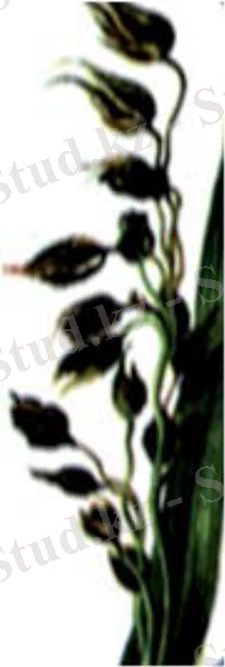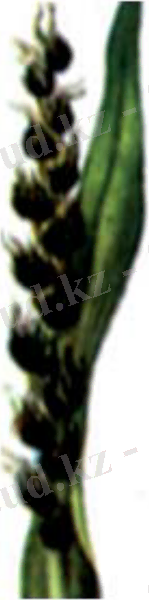 Сұлының тозаңды қара күйесі. Ауру қоздырғышы - Ustilago avenae Jens. саңырауқұлағы (3-сурет) . Телиоспоралары шар тəрізді немесе сопақша, бұрыс пішінді, көлемі 5-9 х 4, 5-9 мкм, түсі ашық-қоңыр, қабығының бір жағы ашық түсті, ұсақ тікенекті немесе те- 62-сурет. Арпаның тасты қара күйесі 63-сурет. Сұлының тозаңды қара күйесі 116 гіс. Споралар тыныштық кезеңінен өтпей бірден 5-350 С (қолайлы 250 С) температура аралығында өнеді. Саңырауқұлақтың екі формасы белгілі: тозаңды (телиоспоралар еркін таралады) жəне қатты (телиоспоралар алғаш бірігіп, соңынан ыдырайды) . Телиоспоралар сұлының гүліне түсіп төрт клеткалы базидияға өнеді де, одан төрт базидиоспоралар түзіледі. Соңғы споралар бүршіктеніп көптеген споридияға айналады. Споридиялар, кейде базидиоспоралар қосылып, инфекциялық жіпшеге өнеді. Ол дəннің қабығы арқылы перикарпийге енеді де геммаға ыдырап, себу мерзіміне дейін сақталады. Егінді жинаған кезде телиоспоралар қабық үстіне немесе астында орнығып қыстап шығады. Көктемде өсімдік екі жолмен залалданады. Біріншісі - дəн бетіндегі немесе қабық астындағы телиоспоралар базидияға өніп, базидиоспоралар береді. Олар жіпшеге өніп, екі-екіден қосылып диплоидты жіпше түзеді. Бұл жіпше өскінді залалдайды. Ерте залалданған өскін көп зардап шегеді. Биіктігі 3 см жоғары өскіндер залалданбайды. Екіншісінде - дəн қабығы астында қыстап шыққан геммалар инфекция қоры болып табылады. Себілген дəн өне бастағанда геммалар да өніп, жаңа жіпшумақ құрып, олар өскінді залалдайды. Екі жағдайда да жіпшумақ өсімдікте диффузды таралып, өсу нүктесіне жетеді де, шашақтану кезеңінде саңырауқұлақ қарқынды дамып, оны ыдыратып, қара спора массасына айналдырады. Инфекция қоры - залалданған дəндегі геммалар мен тұқым қабығы астында жəне үстінде сақталатын телиоспоралар. Аурудың белгісі сұлының шашағы байланған кезеңде байқалады. Саңырауқұлақ залалданған өсімдік шашағының гүл сағағынан басқа бөліктерін зəйтүн-қара түсті телиоспора массасына айналдырады. Шашақтың жоғарғы бөлігі кейде ауруға шалдықпайды.