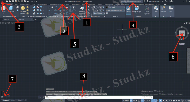 1. Бағдарлама тақырыбы; 2. AutoCAD жүйесінің батырмасы; 3. Меню; 4. AutoCAD анықтамалық жүйесіндегі іздеу; 5. Құрал таспасы; 6. Көру; 7. UCS пиктограммасы; 8. Пәрмен жолы