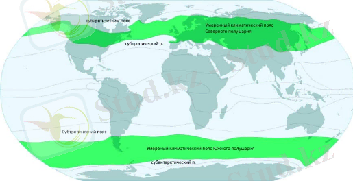 1-сурет. Жер шарының екі жарты шарындағы қоңыржай климаттық белдеуінің географиялық орны
