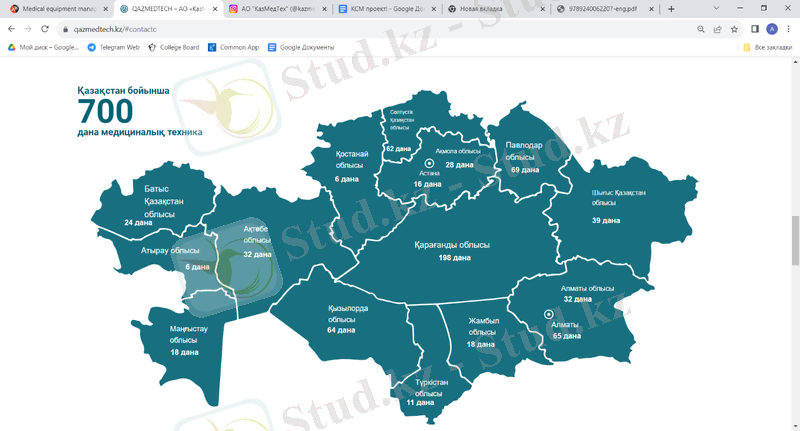 Сонымен қатар, елімізде "Қазмедтех" АҚ медициналық жабдықтарды басқару бөлімшесі рөлін атқарады. Олардың сайтында Қазақстан облыстары бойынша медициналық техника бұйымдарының саны берілген.